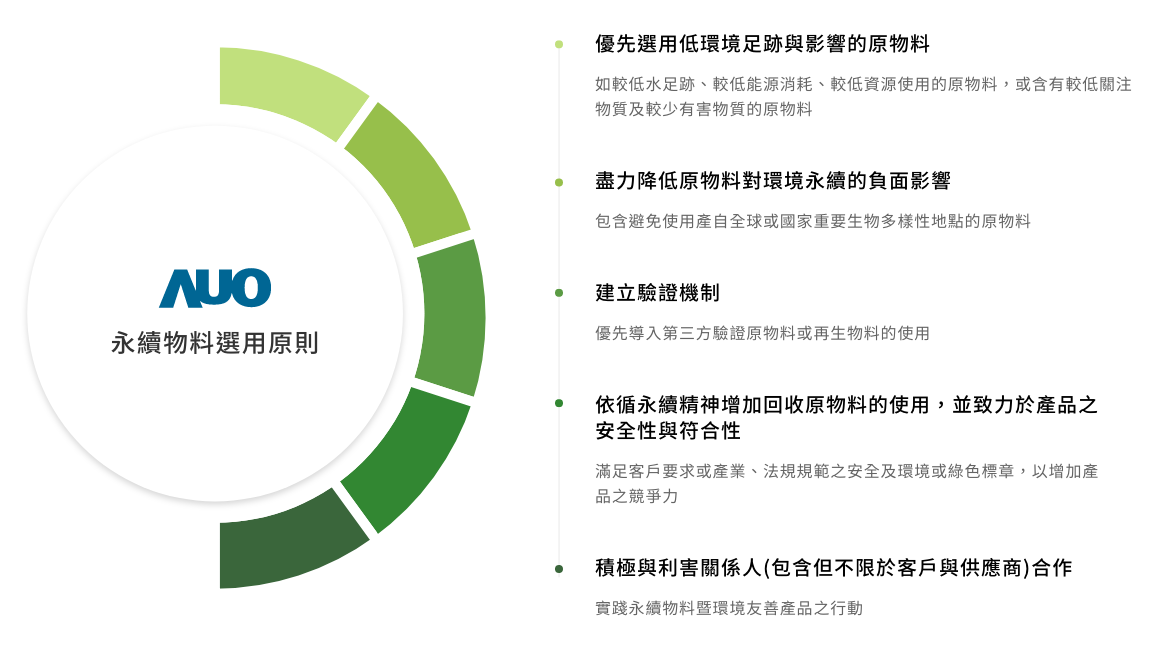 huatihuitiyu華體會(中國)主要產品顯示器面板,面板製造原物料主要使用為玻璃基板與半導體製程所製造之顯示器液晶盒再與相關零件和物料組裝。為選用低環境負荷與風險之原物料,我們於產品生命週期原物料階段,即對我們所使用的原物料進行關鍵原物料之分析評估,包含材質以及重量占比。再依分析結果定義關鍵原物料,優先導入再生物料的使用。